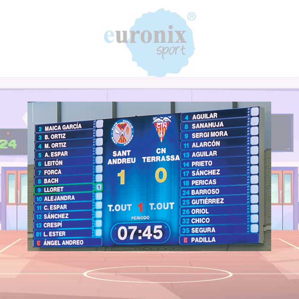 Indoor full color LED display, with high brightness LEDs and a pixel pitch of 6 mm, for use as a video scoreboard and as a video screen.